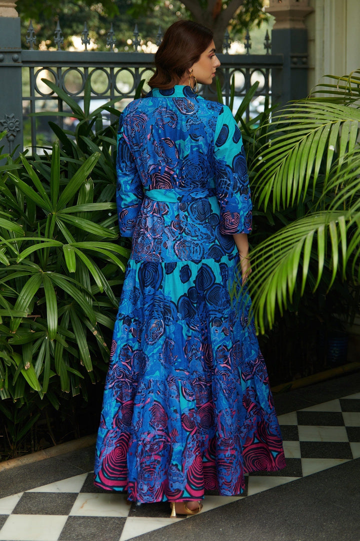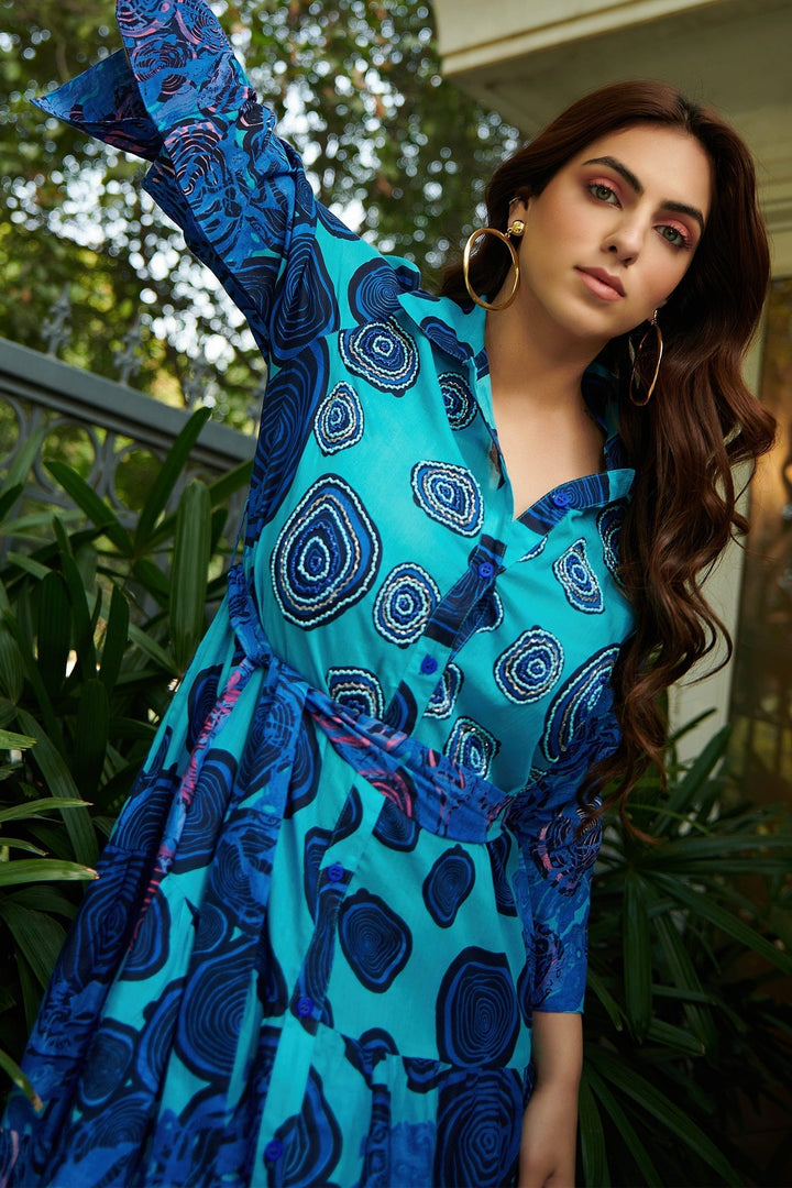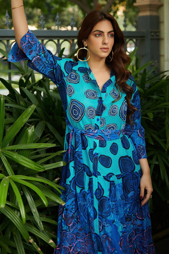 Blue 100% Cambric Cotton Printed Abstract Collar Maxi Shirt Dress