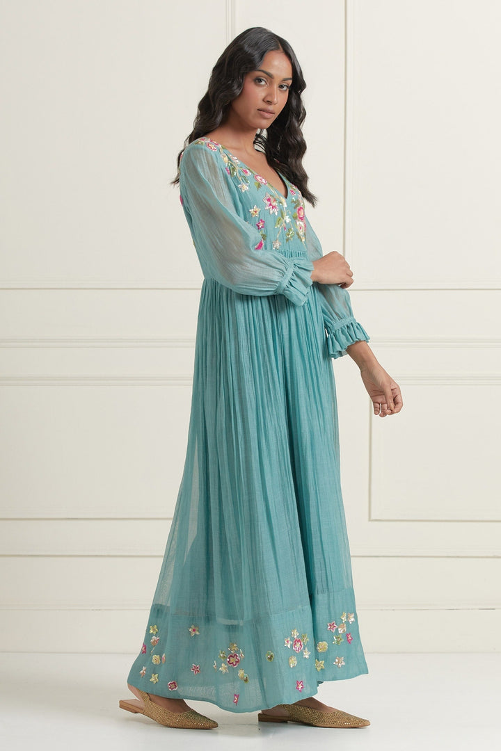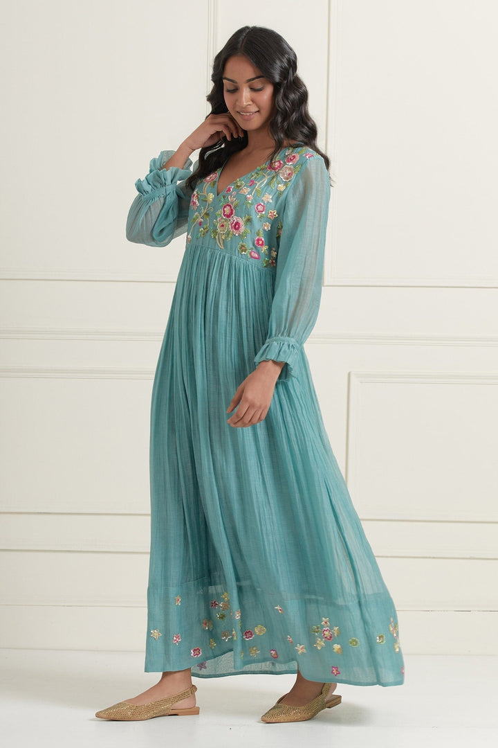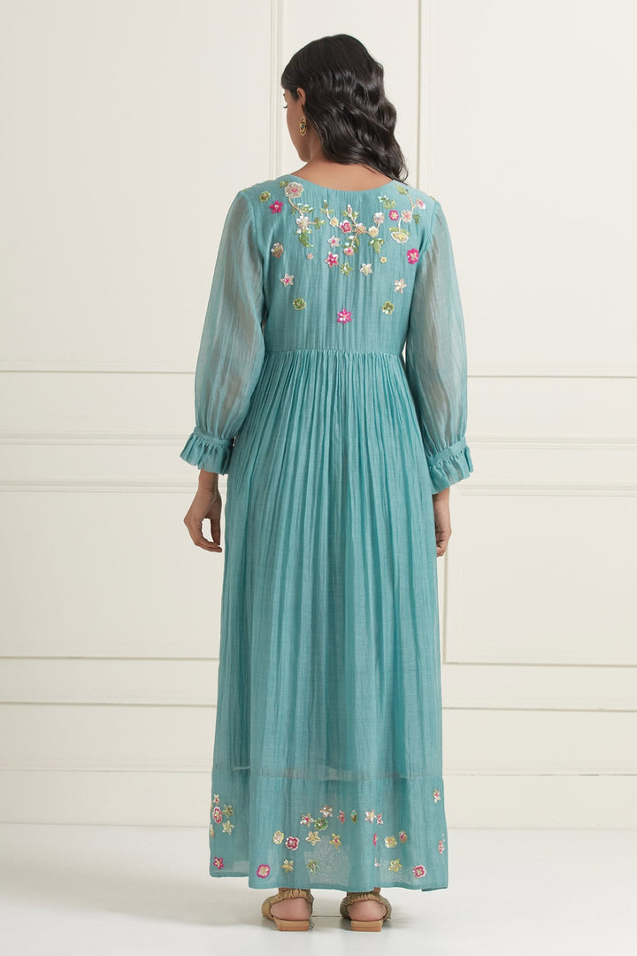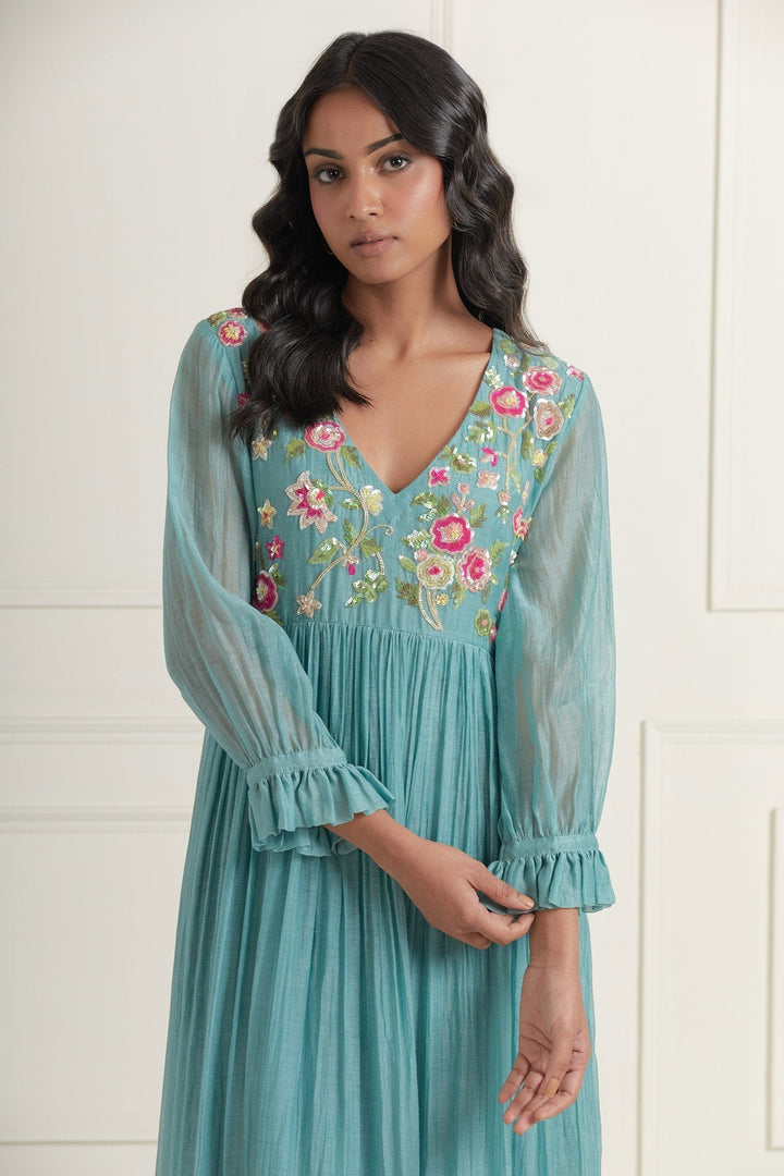 Teal blue chanderi dress with floral sequin embroidered yoke and embroidered hemline.