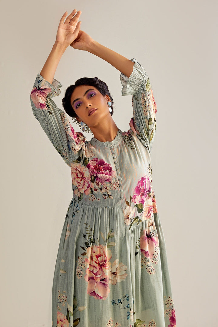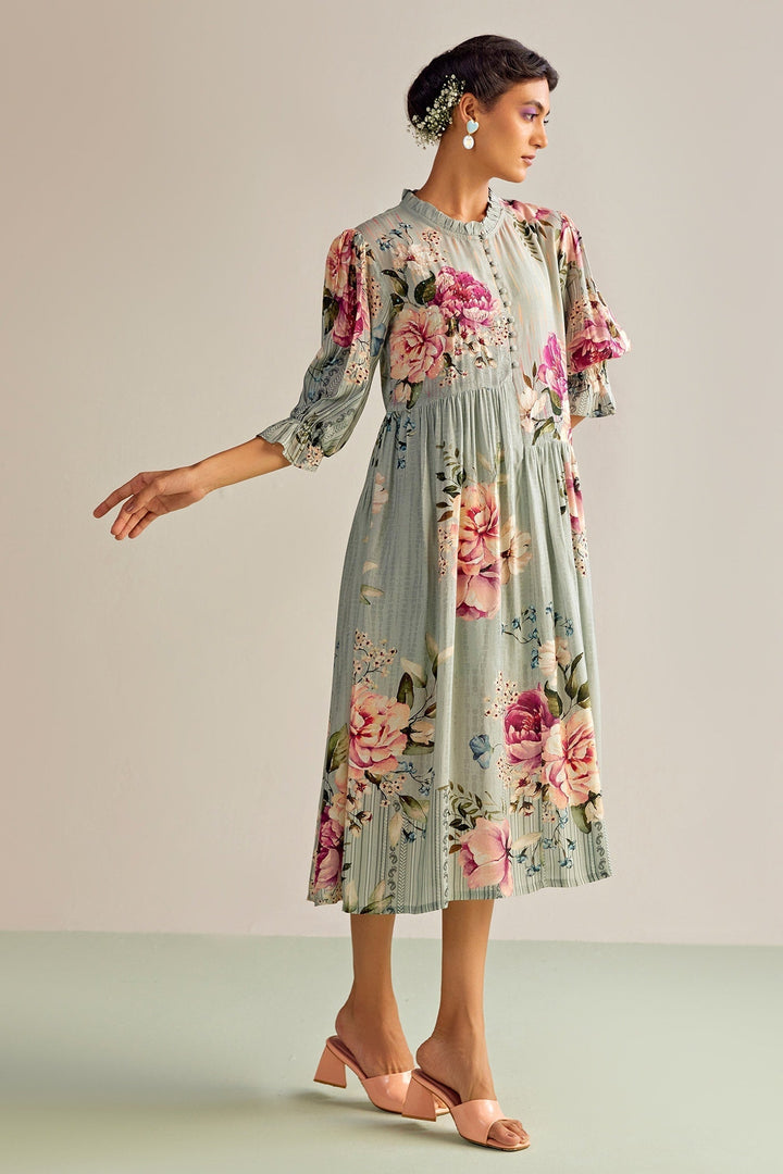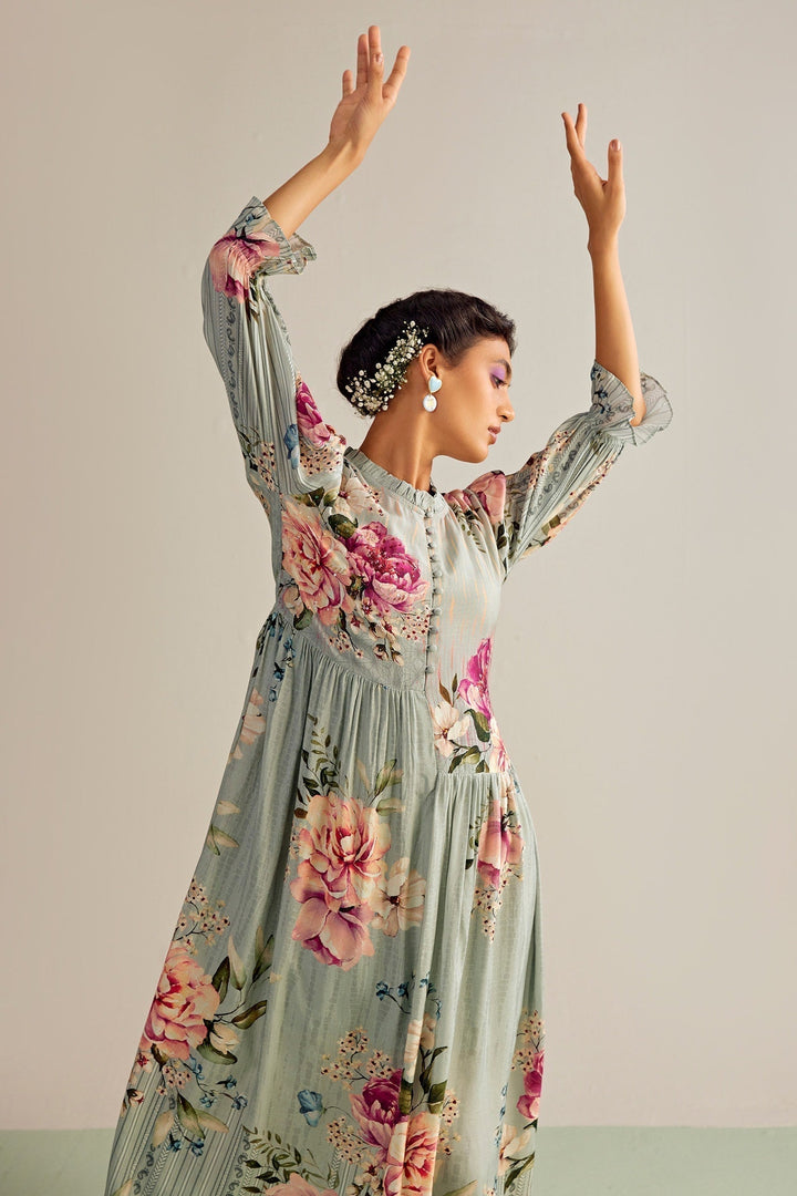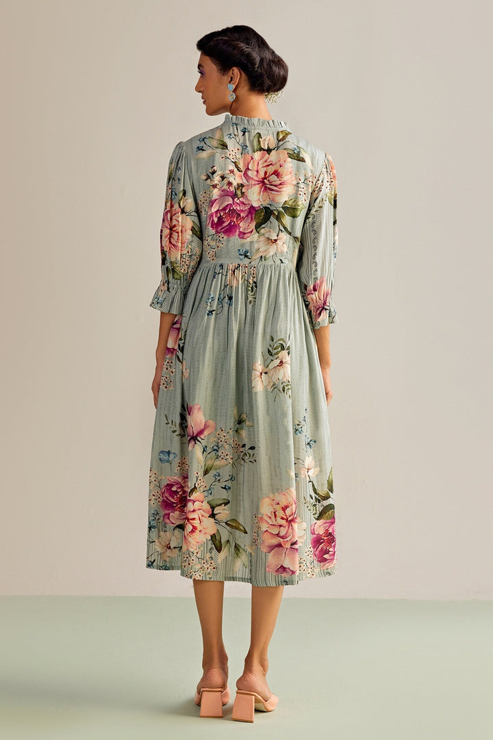 Blue Cotton Silk Printed Floral Motifs Band Collar Evaa Pattern Dress For Women
