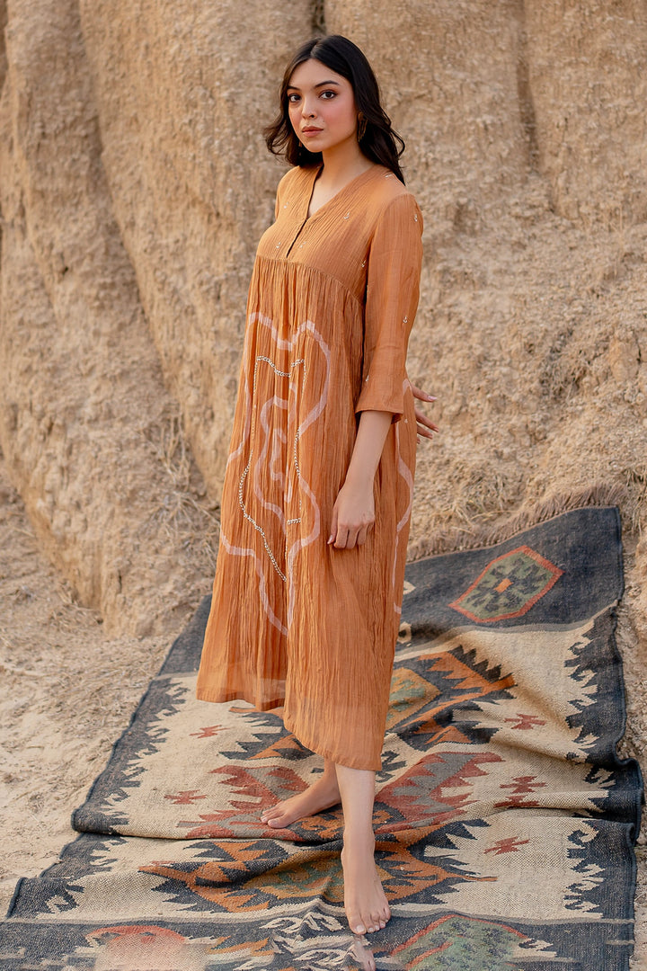 Brown Chanderi Cotton Hand Painted Stroke V Arazi Dress