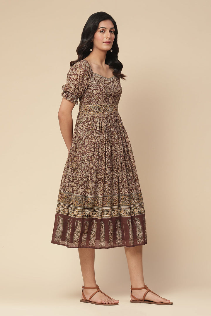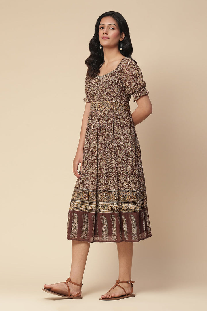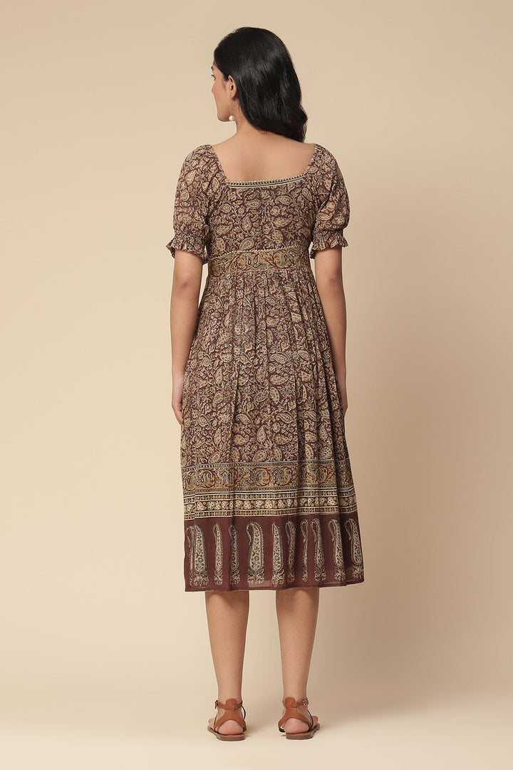 Brown Cotton Voile Print Paisley Garden Stuti Block Midi Dress For Women