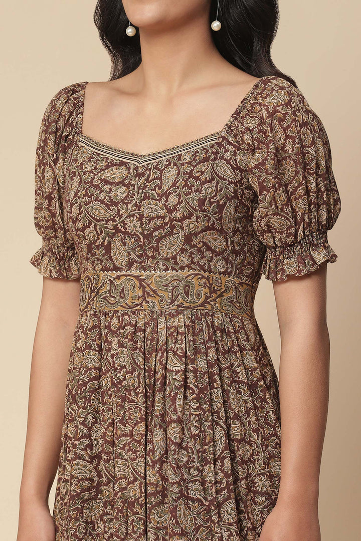 Brown puffed sleeves midi dress crafted in cotton voile with all over paisley garden block print & a flattering sweetheart neckline.