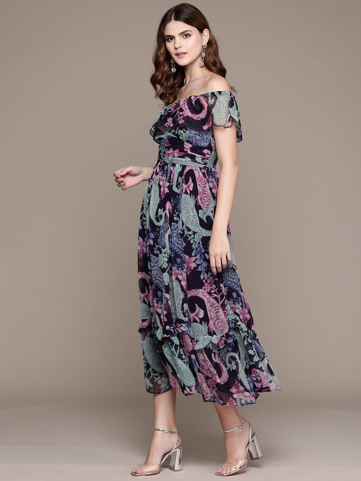 Floral Print Off-Shoulder Flared Sleeve Chiffon Fit & Flare Midi Dress