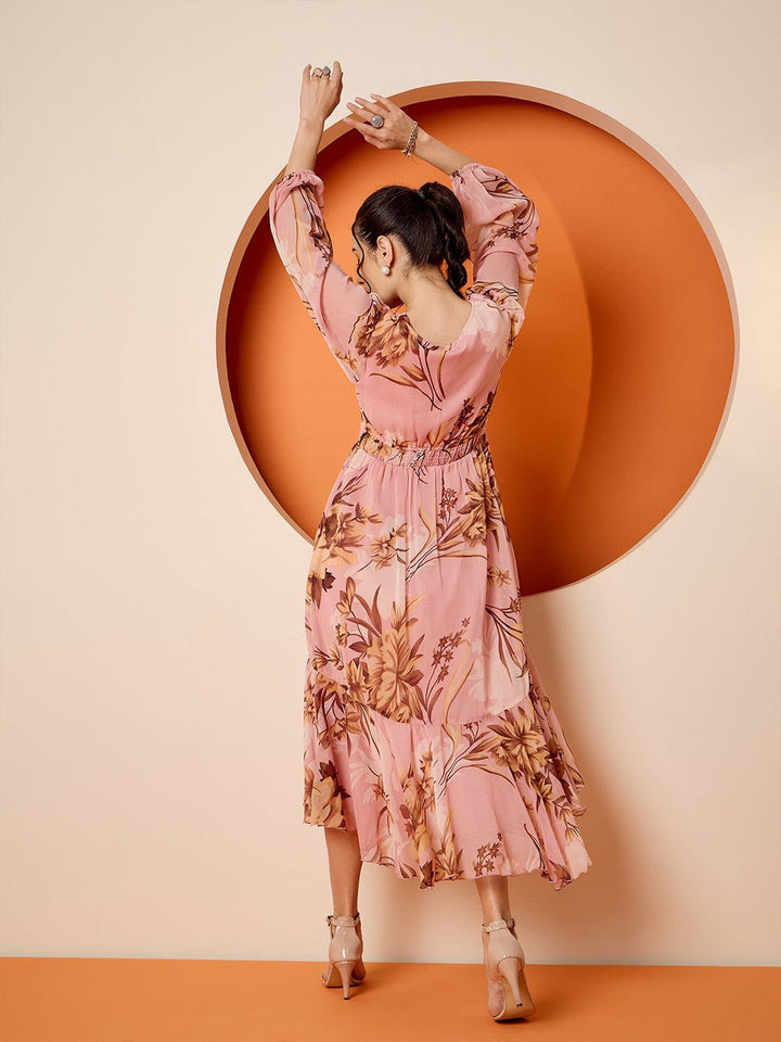 Floral Print Puff Sleeve Chiffon Fit & Flare Midi Dress