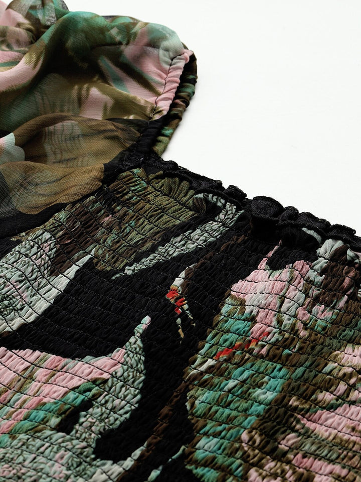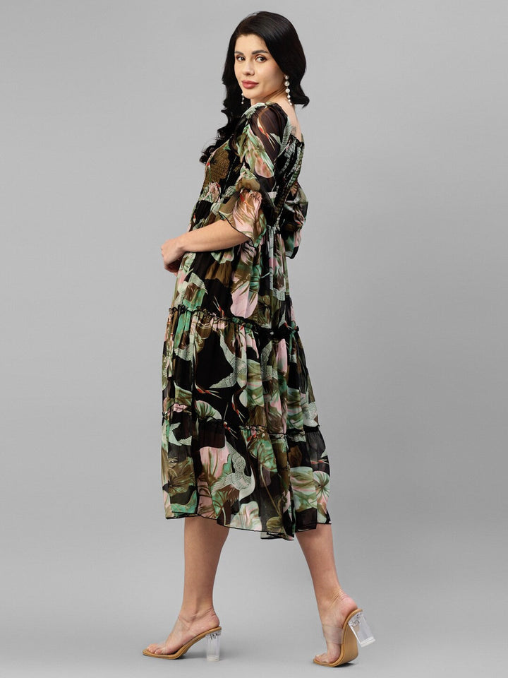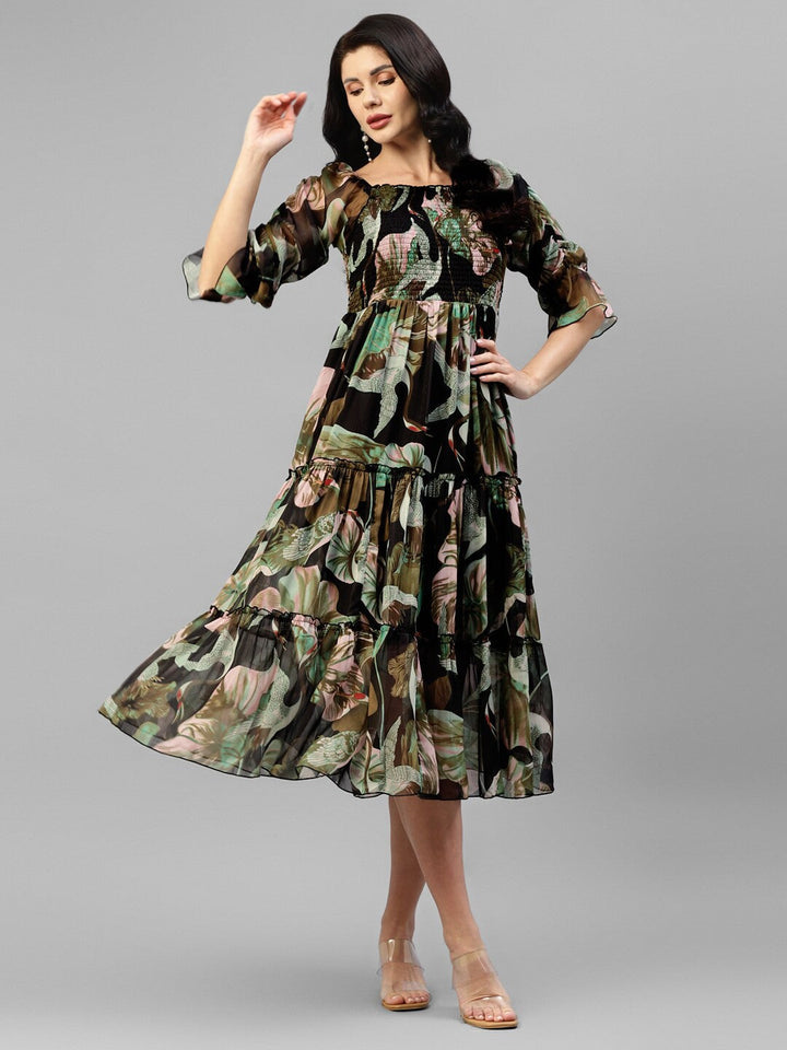 Floral Printed Chiffon Smocked Tiered Fit And Flare Midi Dress