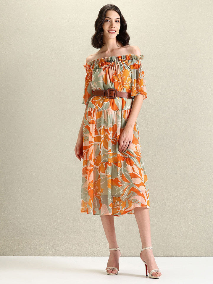Floral Printed Off-Shoulder Gathered Tiered A-Line Dress