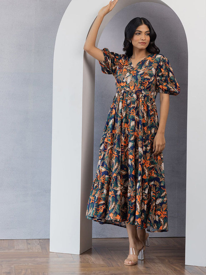 Floral Printed Puff Sleeve Fit & Flare Midi Dress