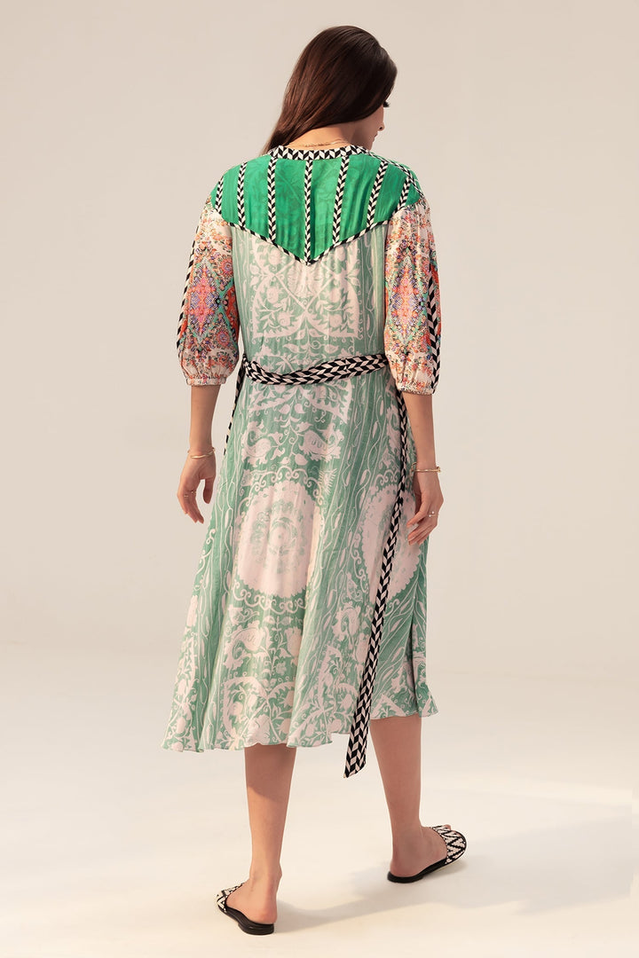 Green Bemberg Georgette Printed Paisley V-neck Elan Blossom Dress