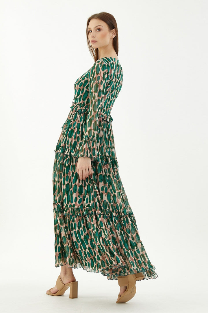 Green Chiffon Abstract V Neck Front Slit Dress