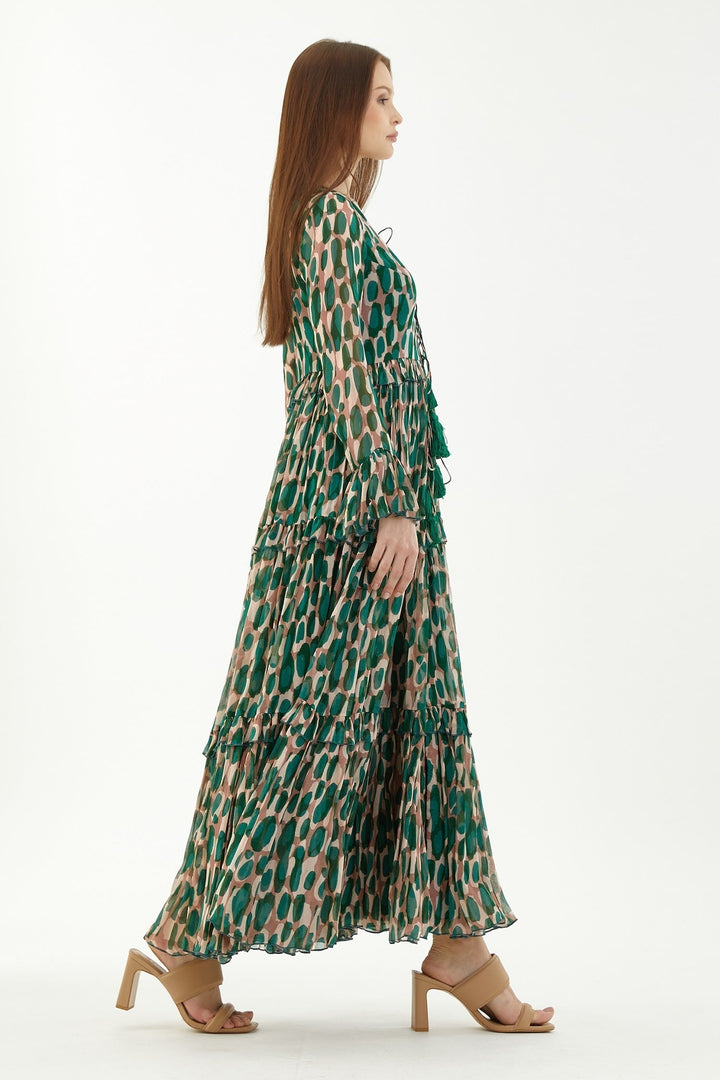 Green and peach frill dress in chiffon base with all over abstract pattern and tassel tie-up.