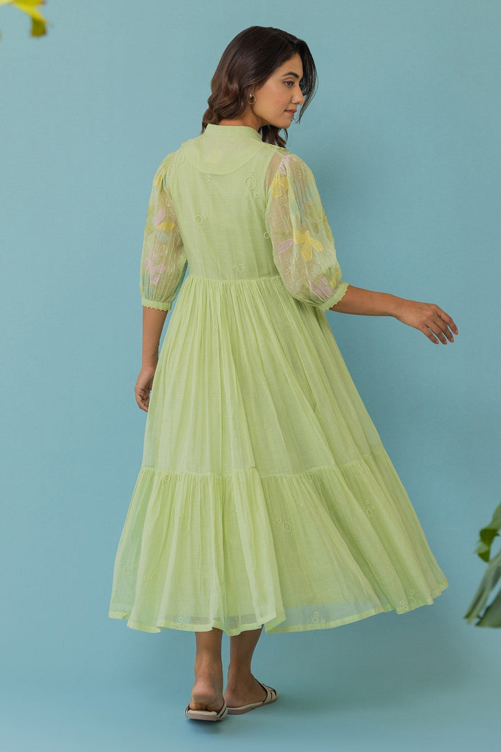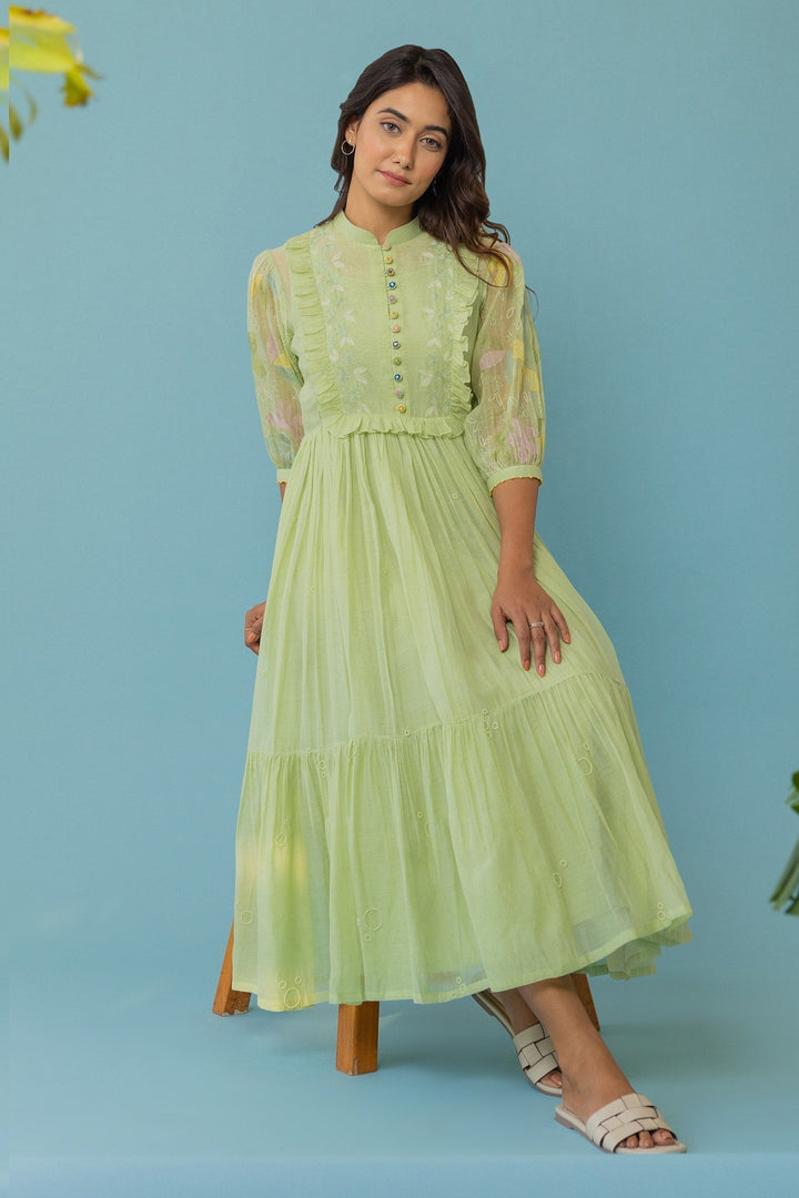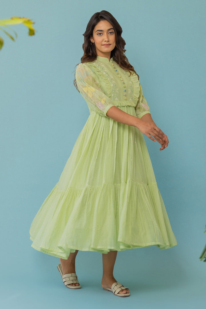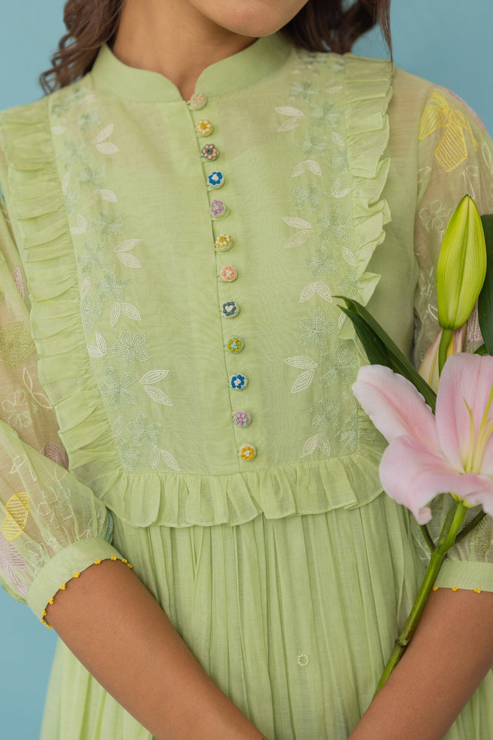 Light green chanderi dress with thread hand embroidered yoke & sleeves, pearl detailing, double frills and buttons.