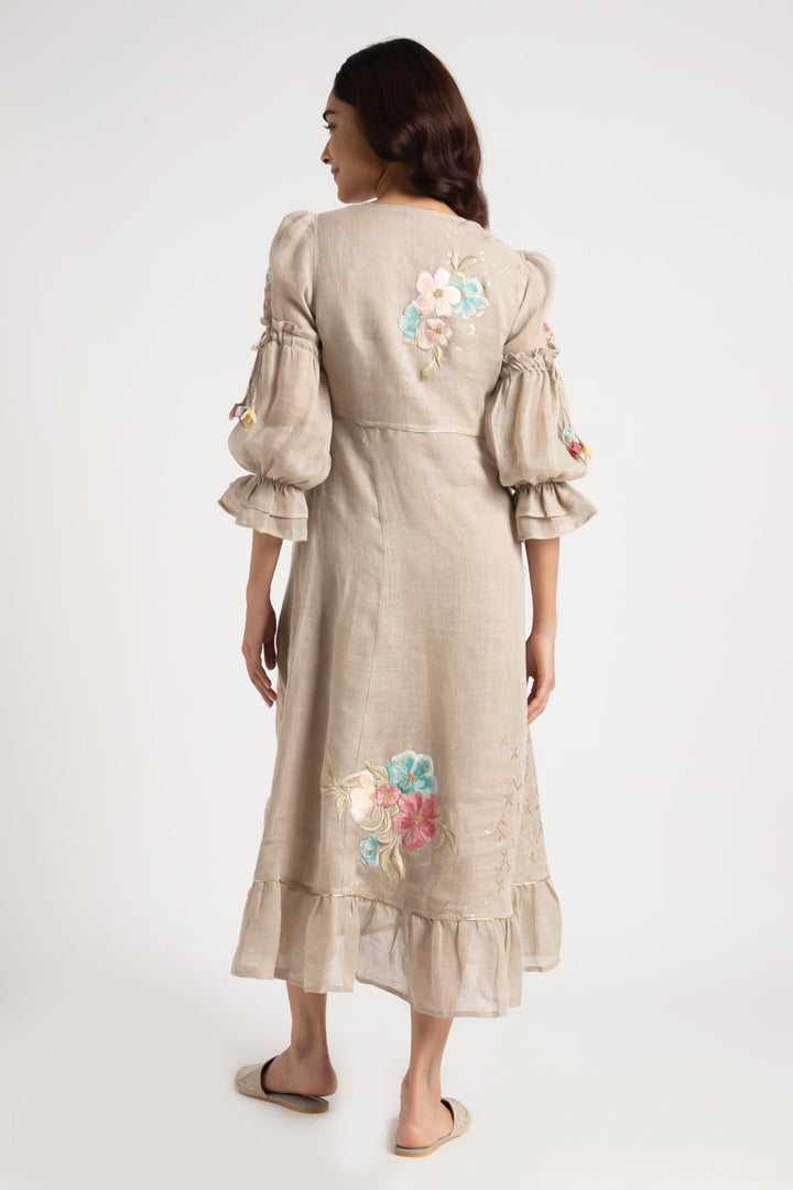 Natural midi dress with floral silk embroidery and ruffled hem.