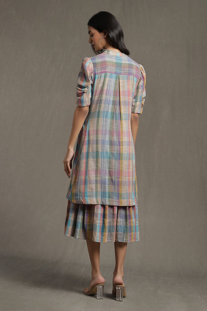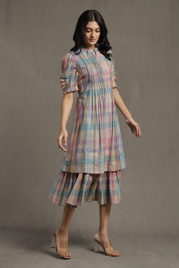 Multi Color Cotton Checkered Print Pintuck Layered Dress