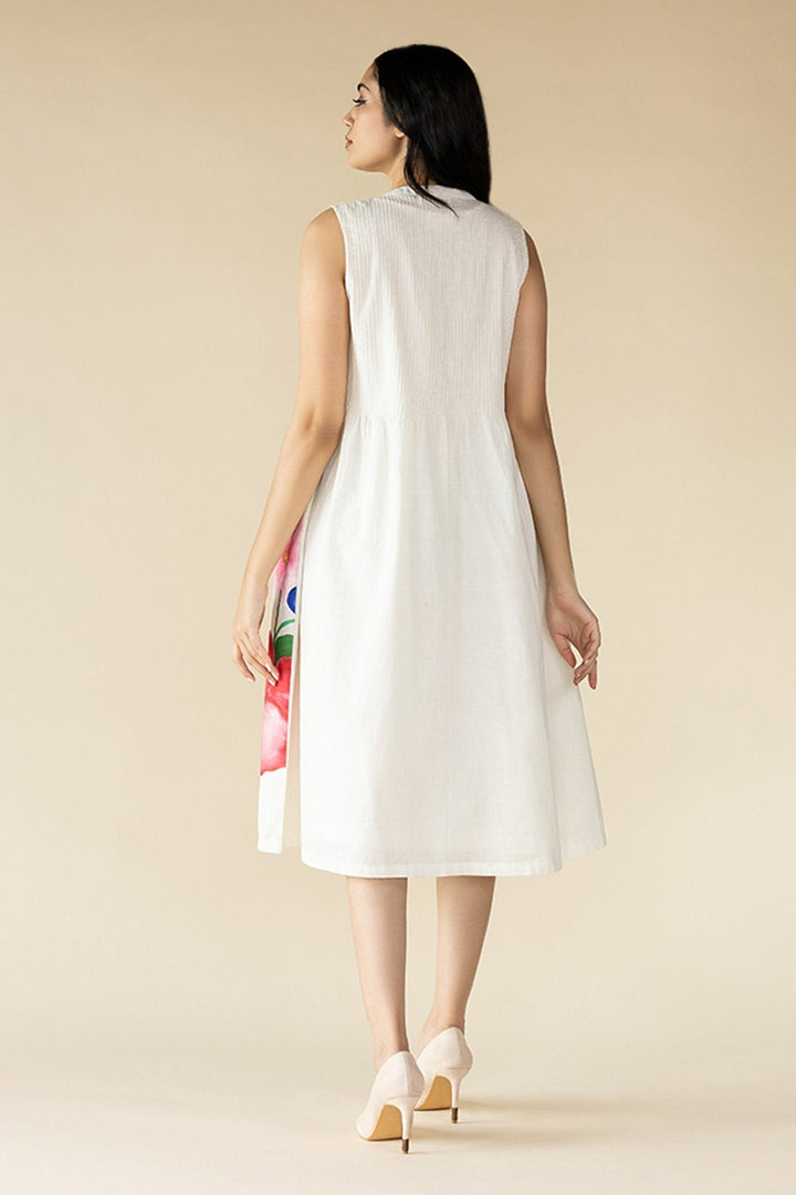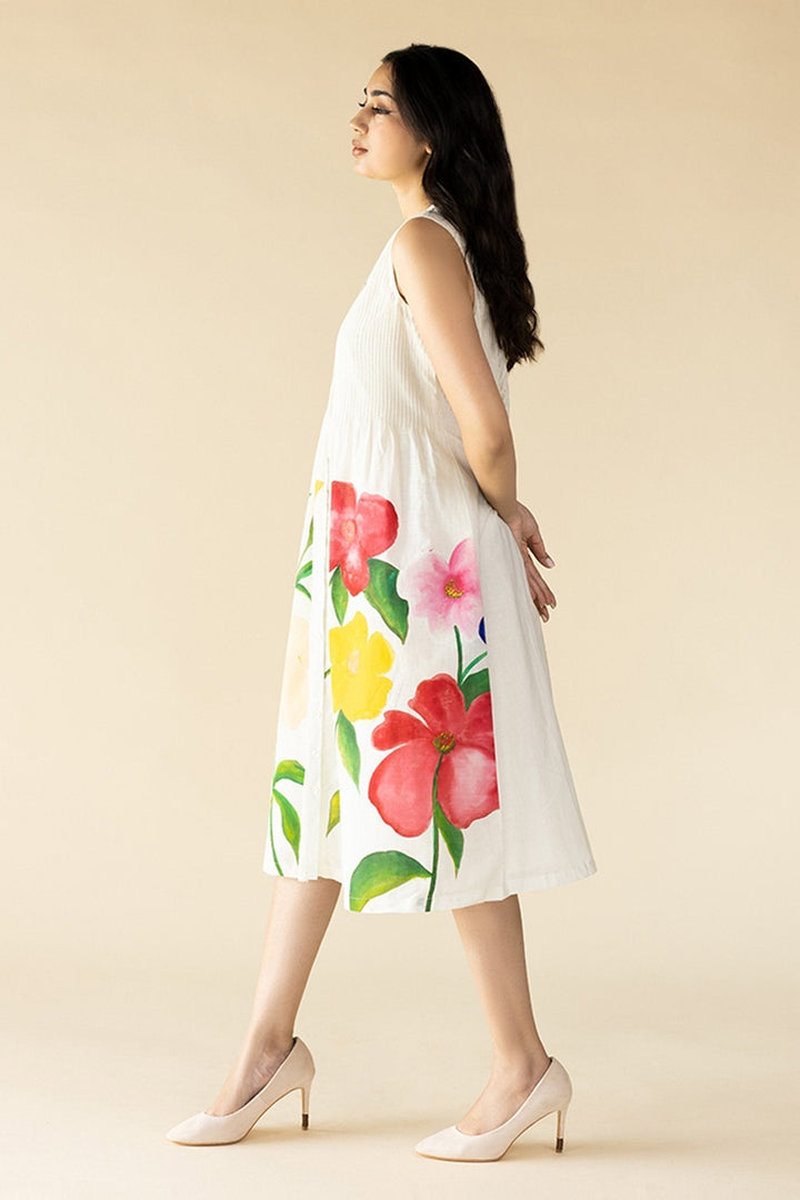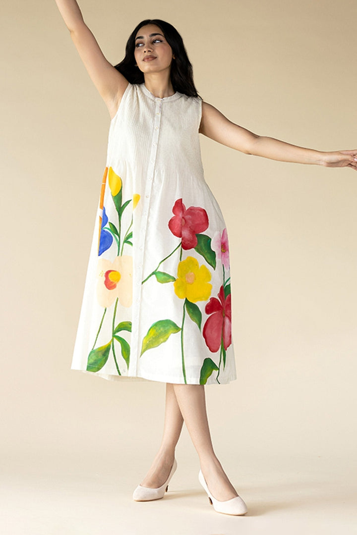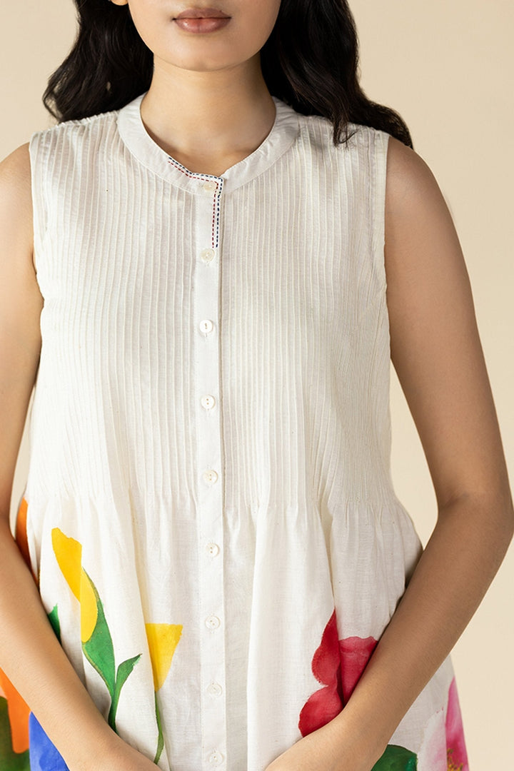 Off white pintuck sleeveless dress with floral hand painted motifs & front buttons.