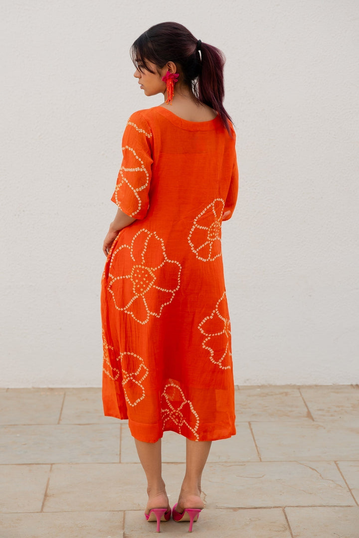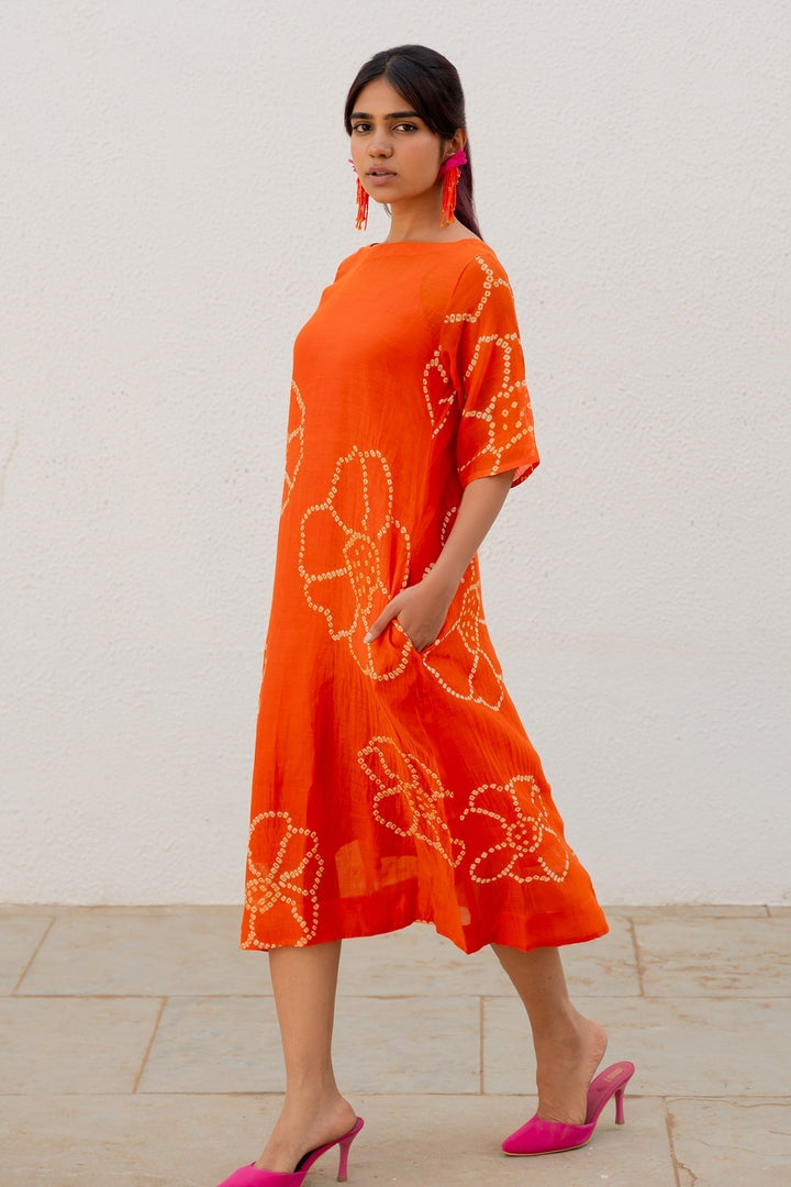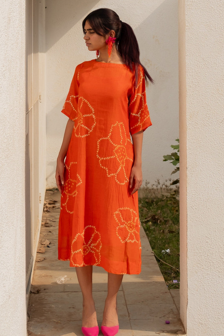 Orange Chanderi Bandhani Floral Boat Neck Pattern A-line Dress For Women