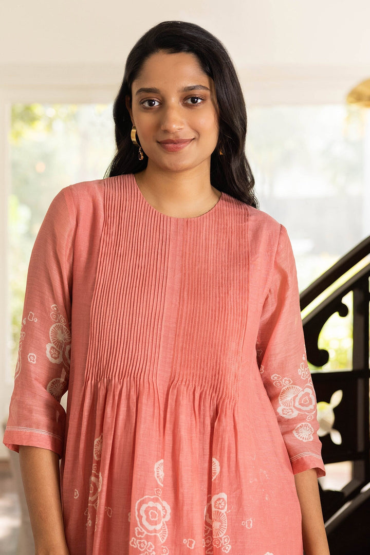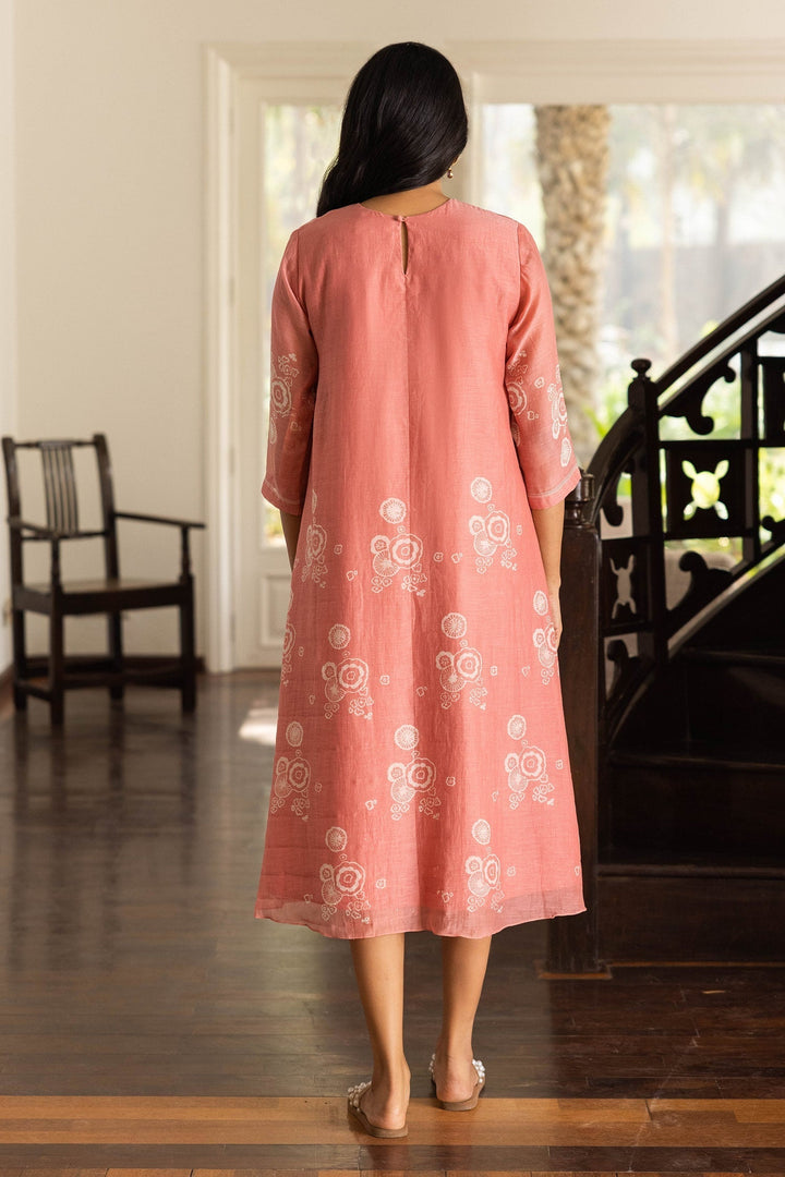 Pink Muslin Cotton Printed Thread Work Coral Pintucked Dress