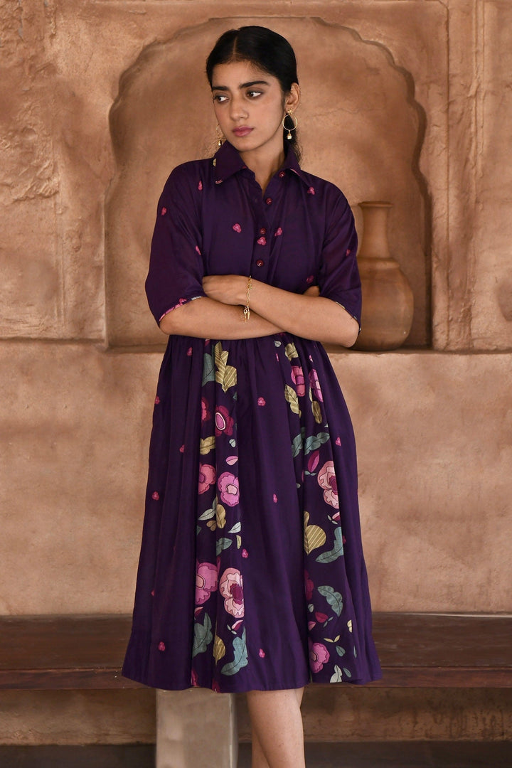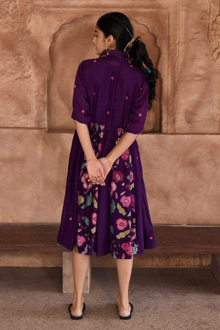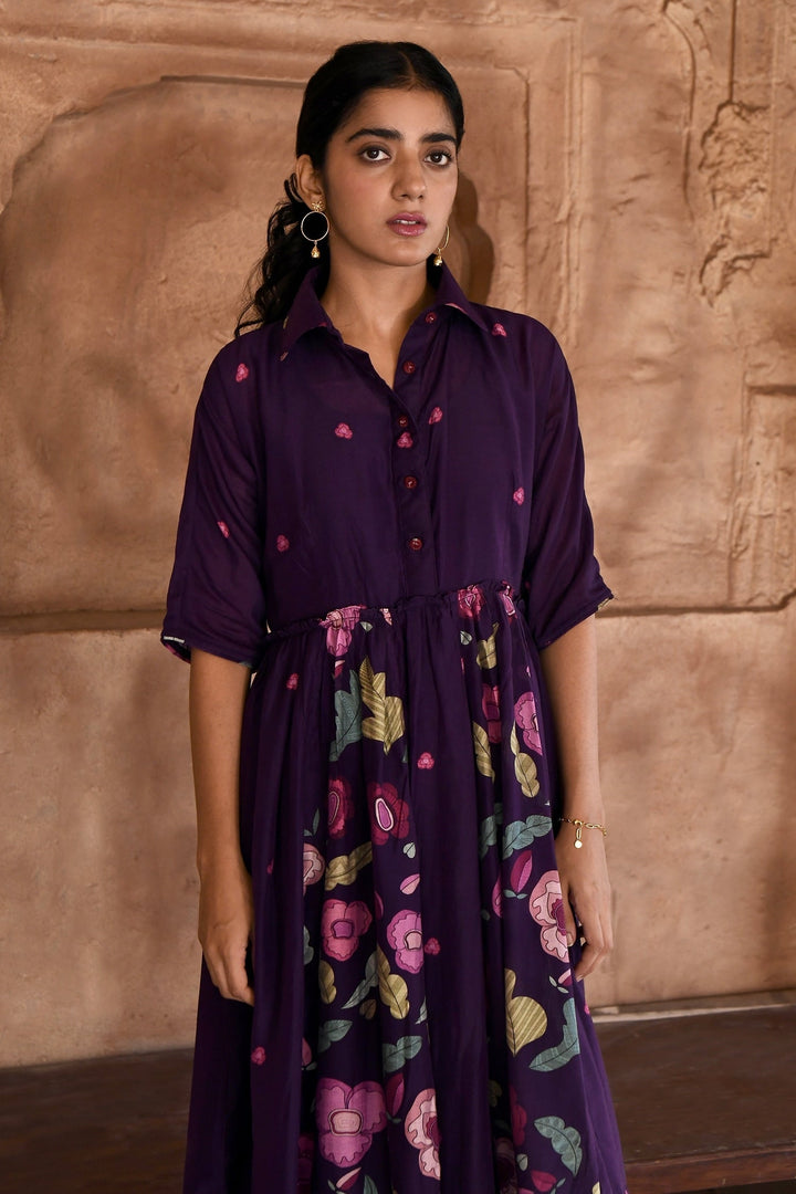 Purple Chanderi Silk Print Floral Mulberry Flower Shirt Dress