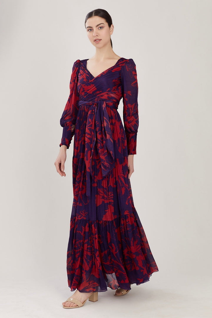 Purple maxi dress with floral printed motifs, front-gathers, tiered detail & puff sleeves.