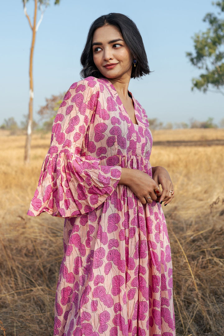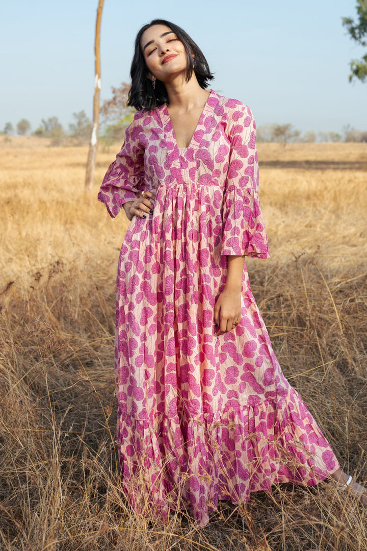 Red Cotton Hand Block Printed Leaf Blunt V Mussoorie Tiered Dress For Women