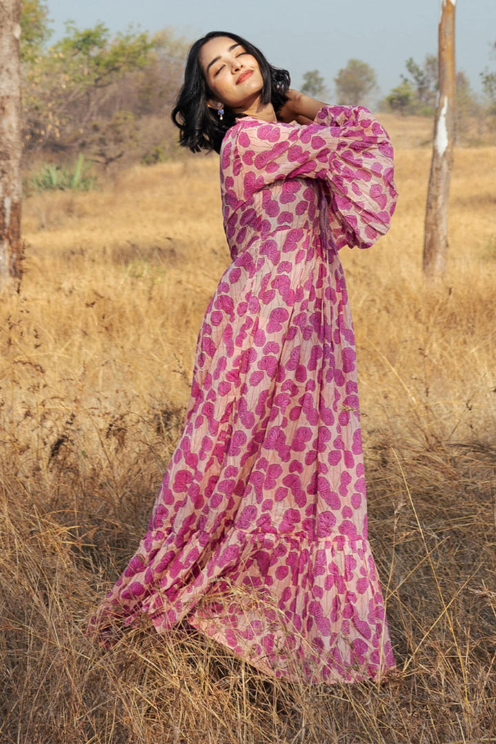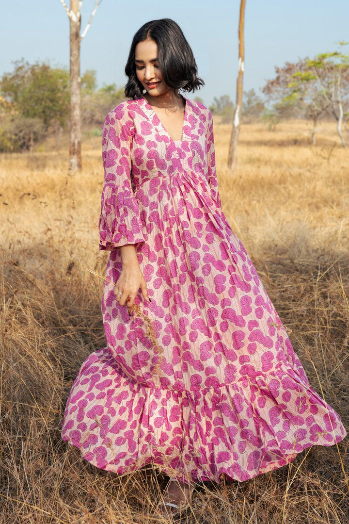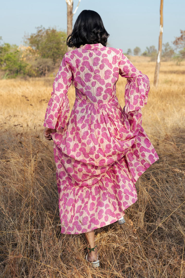 Red leaf hand block printed dress in cotton base & tiered hem.