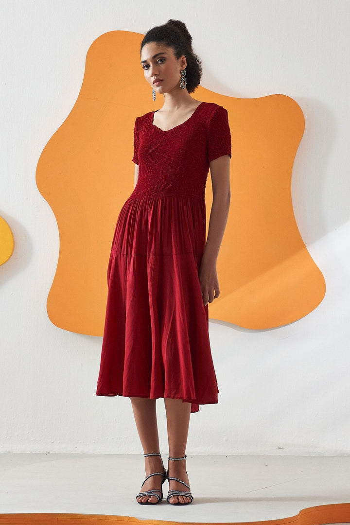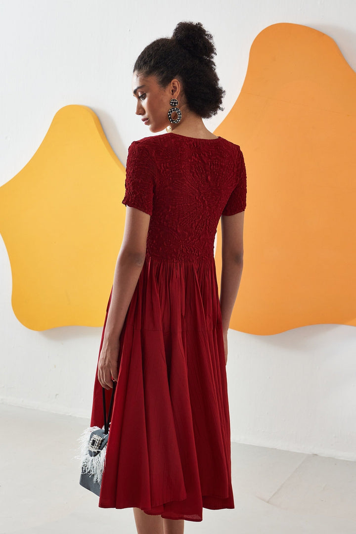 Red Crepe Solid Round Herno Crushed Plain Midi Dress