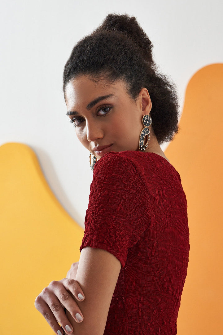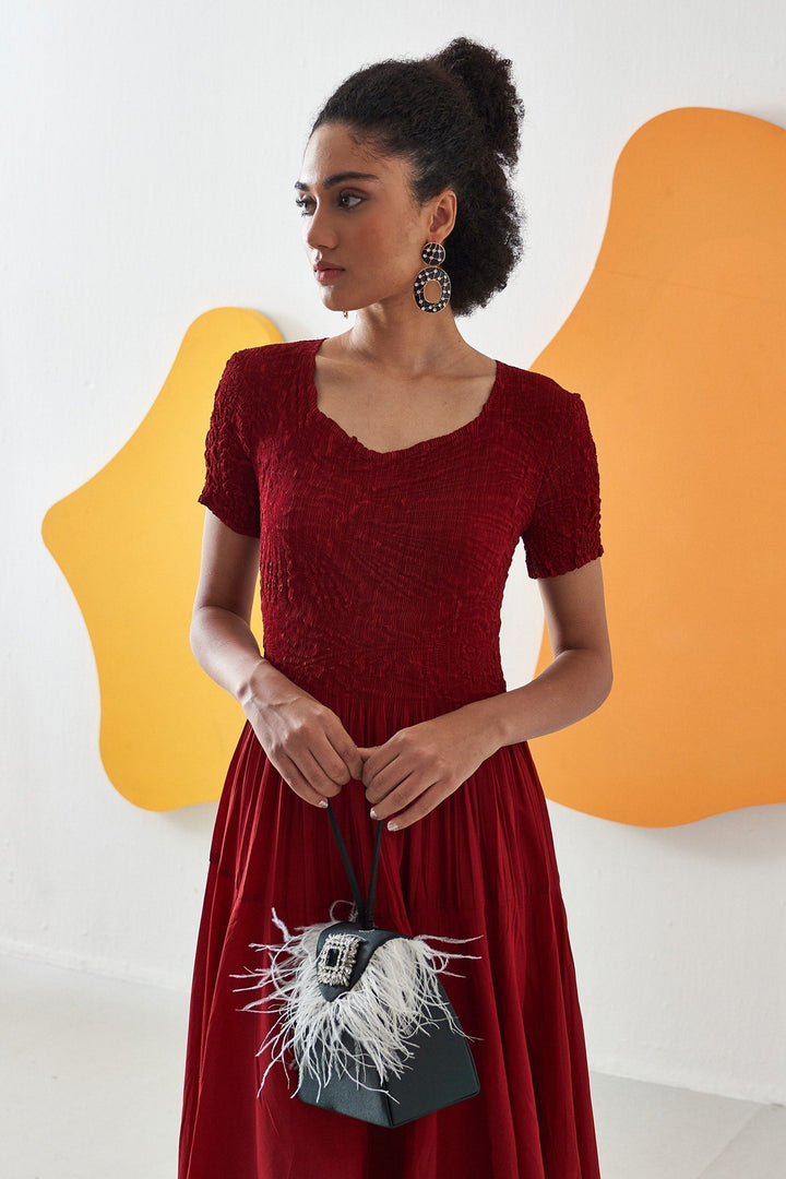Red crepe midi dress with crushed and pleated detailing.