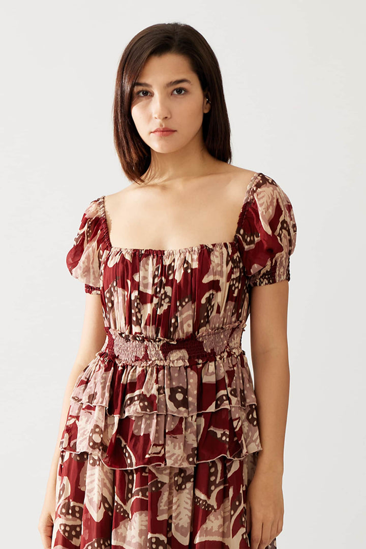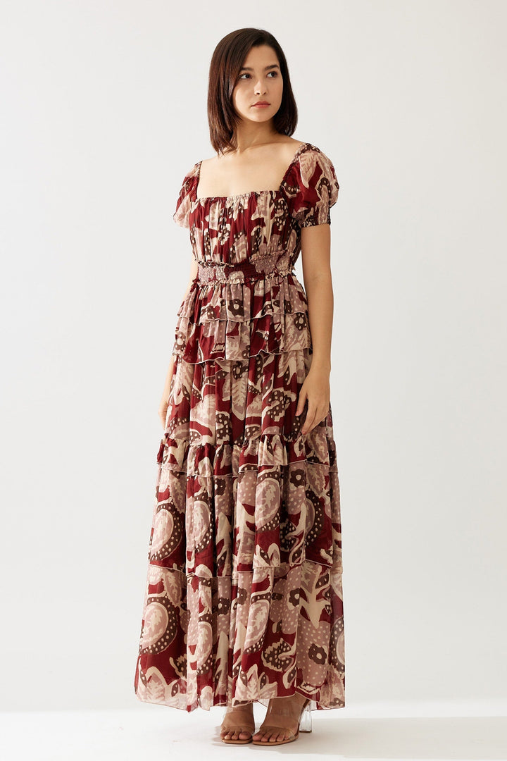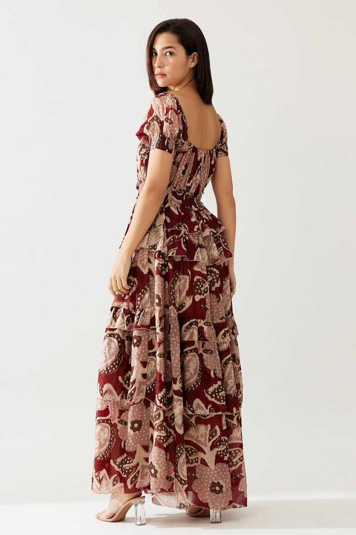 Red Cupro Chiffon Printed Floral Square Frilled Maxi Dress For Women