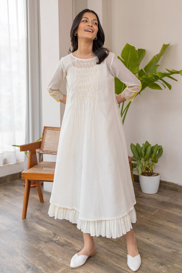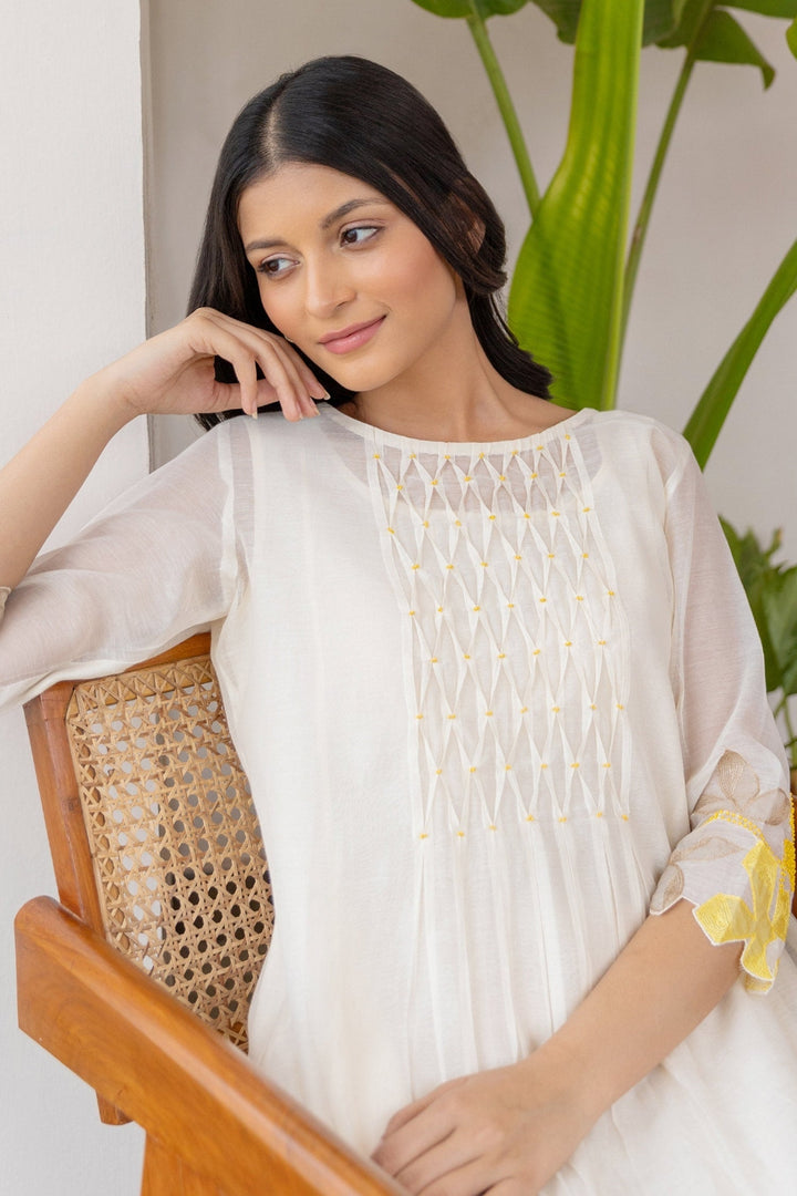 Off-white chanderi dress with smock pattern on yoke & yellow applique embroidered floral motifs on sleeve. Paired with inner.