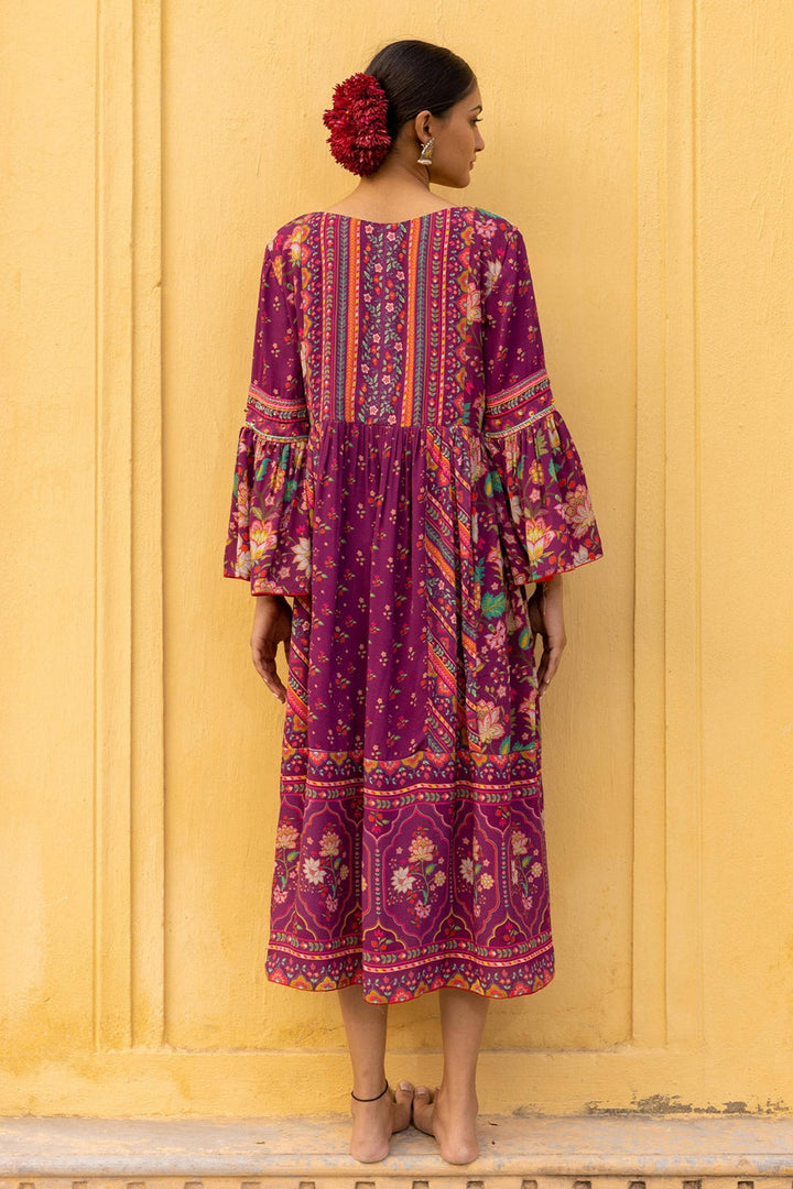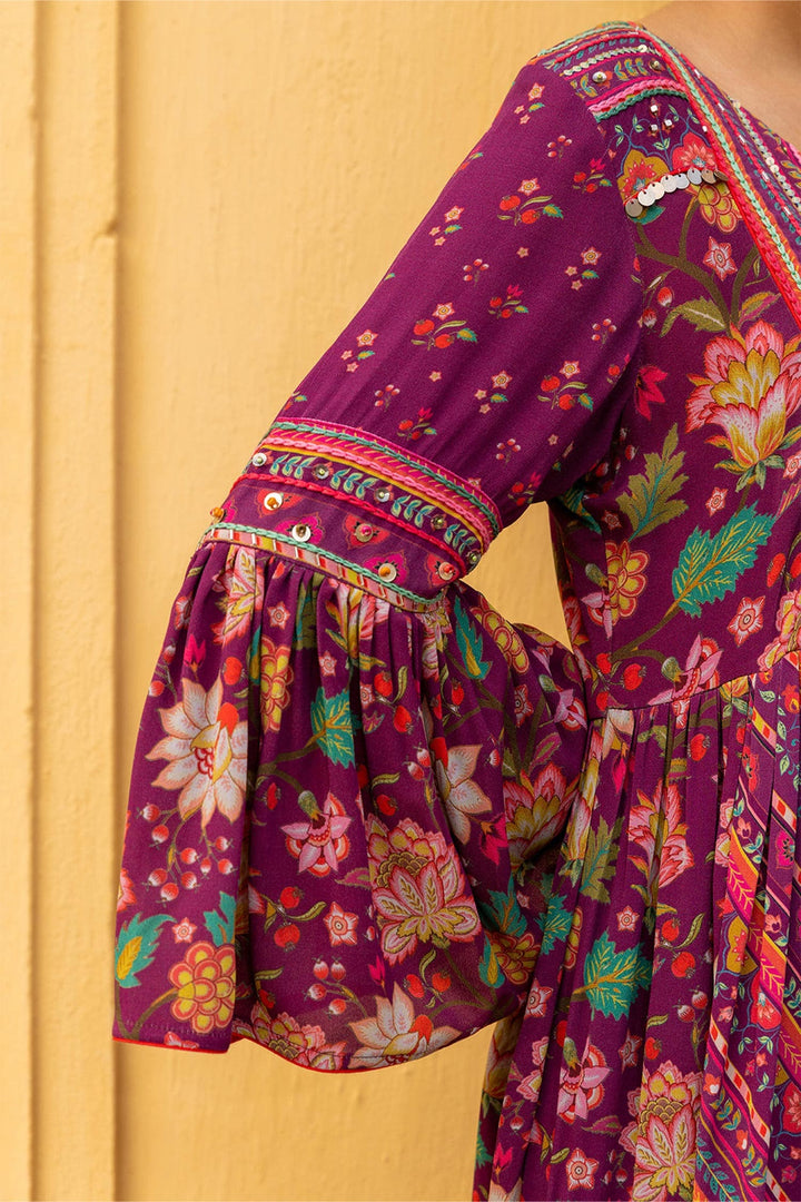 Wine georgette gathered dress with floral print and kasab & sequins embroidered yoke.