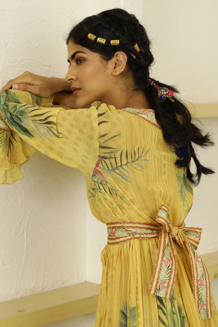 Yellow midi dress in striped detail, tropical floral motifs, V-neck & layered bell sleeves. Paired with floral motif belt.